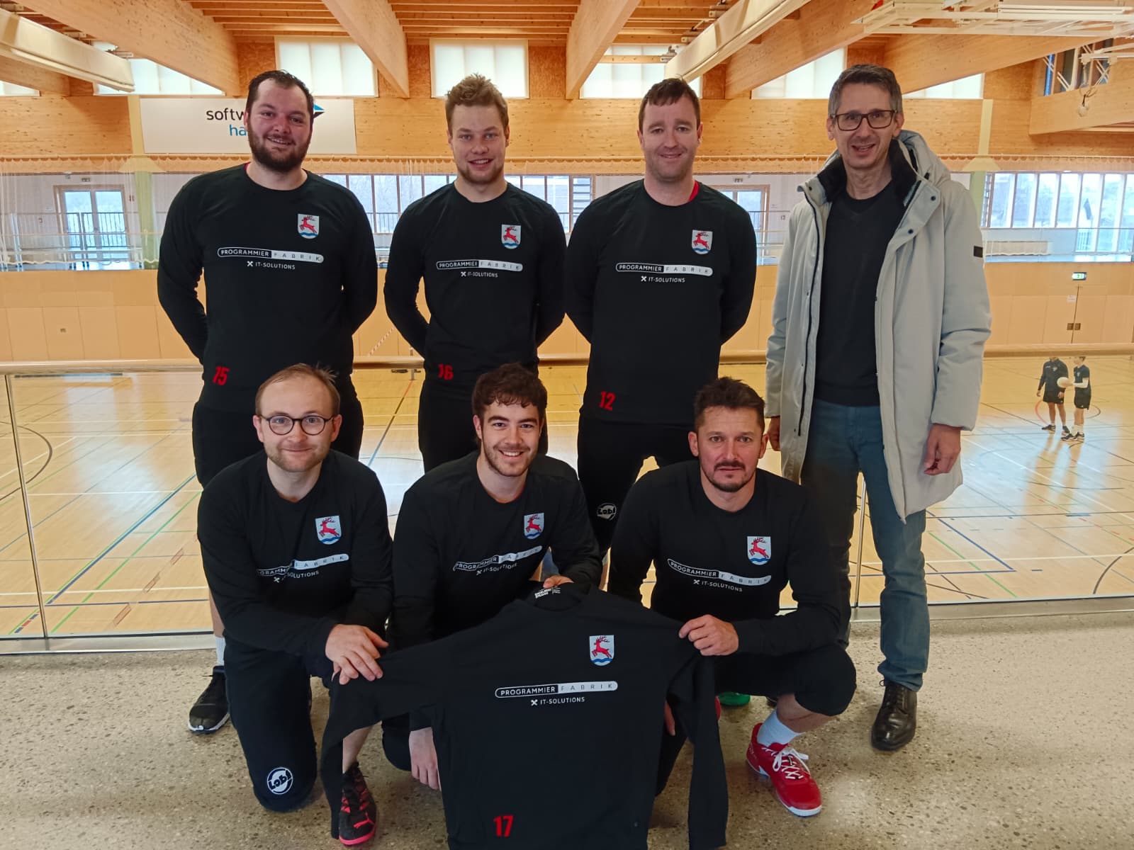 Daher haben wir die Sportunion Hirschbach – Sektion Faustball sehr gerne mit neuen Dressen unterstützt. Die Übergabe fand am 20. Dezember im Rahmen der Meisterschaftsrunde in Hagenberg statt und bot einen würdigen Rahmen für diese Zusammenarbeit, auch weil unser Unternehmen vor mehr als 30 Jahren in Hagenberg gegründet wurde. Bei diesem Termin entstand auch ein gemeinsames Foto, das den Moment der offiziellen Übergabe festhält.