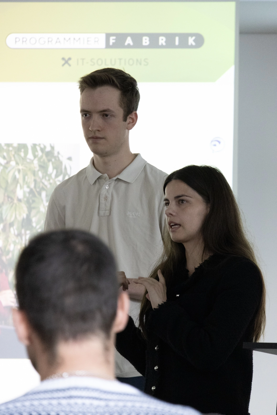 Die Präsentation fand in englischer Sprache statt, um der internationalen Ausrichtung der Coding School gerecht zu werden. Neben der Vorstellung laufender Projekte und technischer Kernkompetenzen wurden auch Aspekte der Unternehmenskultur und der persönlichen Entwicklungsmöglichkeiten innerhalb der PROGRAMMIERFABRIK thematisiert.